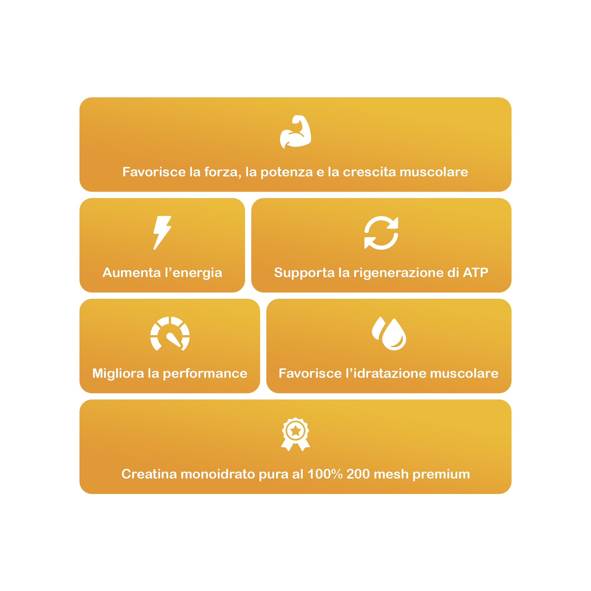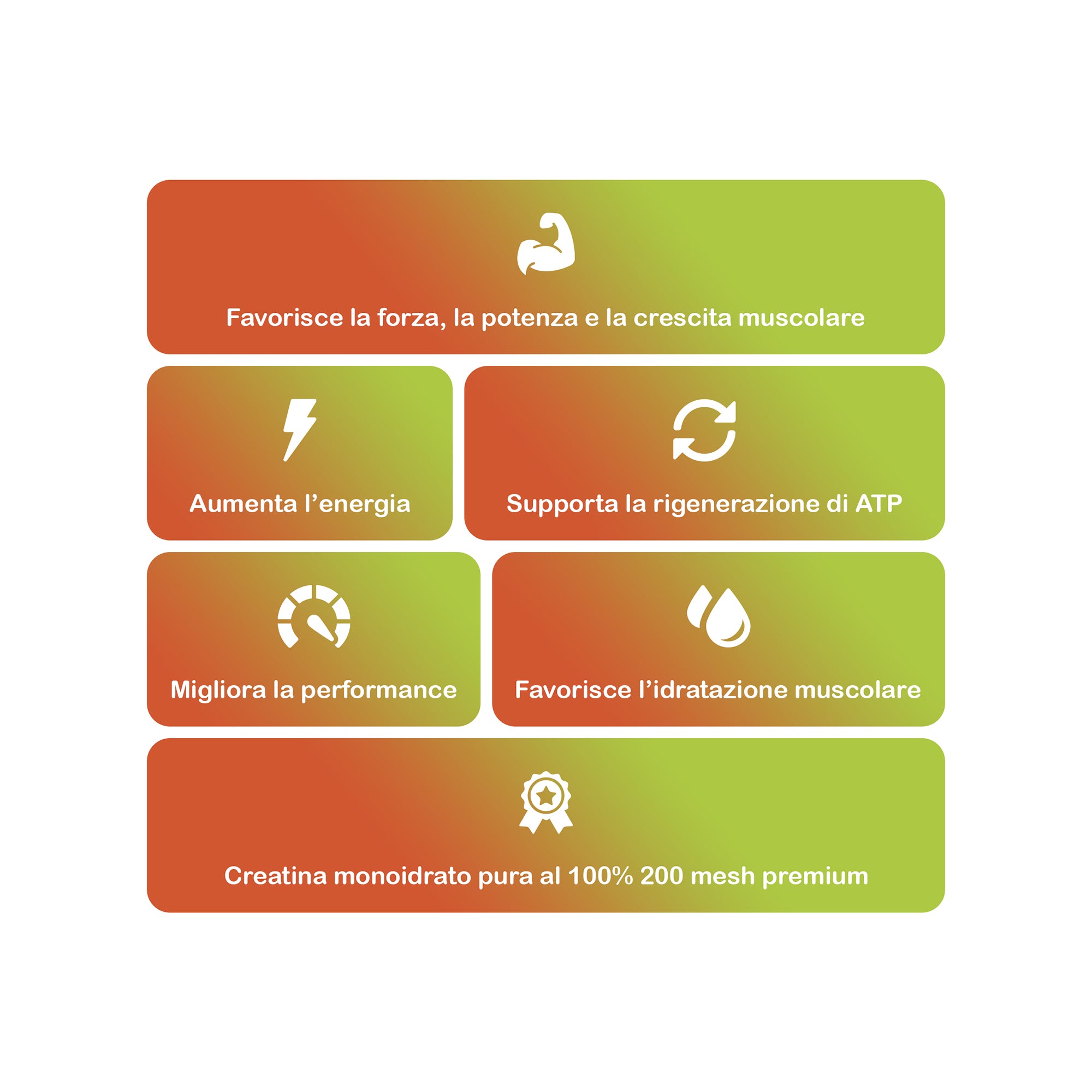 Premium Creatine Monohydrate a dosaggio completo per crescita muscolare, forza e performance. Uno degli integratori naturali più efficaci e più studiati al mondo, ideale per chi vuole migliorare potenza, resistenza e volume muscolare in modo sicuro e comprovato. Formulata con creatina monoidrato pura al 100% 200 mesh premium, garantisce massima qualità, solubilità e assorbimento ottimale. Supporta la rigenerazione di ATP, la principale fonte di energia muscolare, contribuendo ad aumentare la forza, la potenza e la crescita muscolare. Può aiutare a migliorare le prestazioni fisiche producendo rapidamente energia durante l’attività intensa e favorisce l’idratazione intracellulare, migliorando il volume e la performance complessiva. Può inoltre fornire benefici cognitivi se assunta in dosaggi elevati (10–20g). Disponibile in versione neutra o aromatizzata, rappresenta una soluzione semplice, efficace e di alta qualità per sostenere la crescita muscolare, la forza e la resistenza in ogni fase dell’allenamento.